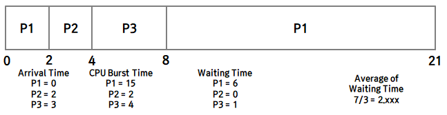 또한 SJF는 스케쥴링 정책에 따라 선점 알고리즘이 될 수도 있고 비선점 알고리즘이 될 수도 있습니다. Ready queue에 들어온 process의 CPU 작업 시간이 현재 CPU에서 실행 중인 process의 잔여 작업 시간보다 적을 때 선점을 하여 CPU를 빼앗게 되면 선점 알고리즘이 되는 것이고, 선점을 하지는 않고 ready queue 내에서만 우선순위에 따라 실행 순서를 정하면 비선점 알고리즘이 되는 것입니다. 이 중 선점형 SJF 알고리즘은 Shortest Remaining Time First Scheduling (최소 잔여 시간 우선 스케쥴링)이라고도 불립니다.