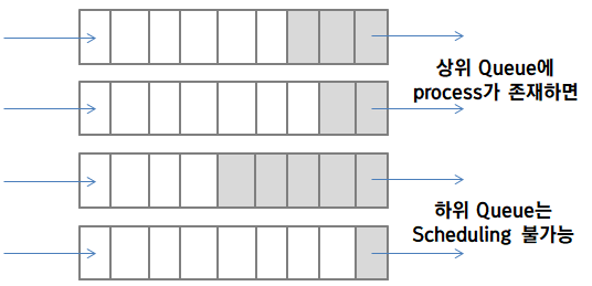 마지막으로 알아볼 내용은 다단계 피드백 큐 스케쥴링입니다. 다단계 큐 스케쥴링에서는 여러개의 queue를 계층적으로 이용하여 구현을 합니다. 각 queue들은 각각의 스케쥴링 알고리즘들을 가지는 독립적인 queue입니다. 모든 process들은 메모리 크기, process의 우선 순위, process 유형 등과 샅은 특성에 따라 한 개의 queue에 영구적으로 할당됩니다. 그래서 CPU에 할당받기 위해서는 자신이 배정된 queue에만 들어갈 수 있습니다. 다단계 큐 스케쥴링에서는 queue들 사이에도 우선순위 스케쥴링이 되어있어 상위에 있는 queue의 process들이 우선순위가 높아 먼저 CPU를 할당받으며, 반드시 자신 보다 상위에 있는 queue가 비어있을 때에만 스케쥴링을 시작합니다.
