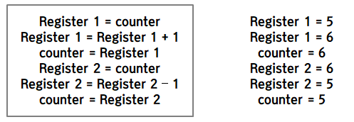 컴퓨터 구조에서 배웠듯이 Register 1에 counter 값을 가져와서 수정을 해준 뒤 다시 counter 변수에 옮겨주는 형태입니다. 결과적으로 데이터를 한 개 집어넣은 뒤 하나를 빼냈기 때문에, counter 값은 그대로 5가 되어 올바른 값이 나옵니다. 하지만, 타이밍의 문제로 A의 호출 거의 직후에 B가 실행되면 다음과 같이 실행되는 경우가 발생할 수 있습니다.