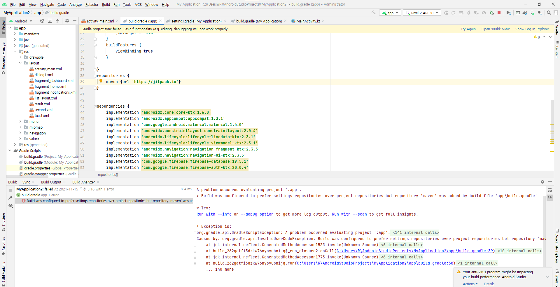 repositories의 코드를 project 수준의 gradle에 삽입해면 gradle sync는 실행되지만 아래의 캡쳐와 같이 xml 파일에서 에러가 발생한다.