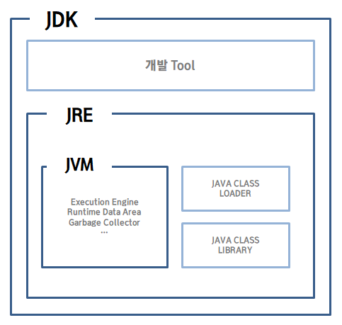 JRE도 이름 그대로 해석이 가능합니다. 자바를 실행하기 위한 환경을 조성해 주기 위한 소프트웨어로서, 크게 JDK, JAVA Class Loader(자바 클래스 로더), JAVA Class Library(자바 클래스 라이브러리)로 구성됩니다. 1번에서 살펴보았던 JDK는 JRE에 포함되는 구성요소였던 것이죠!