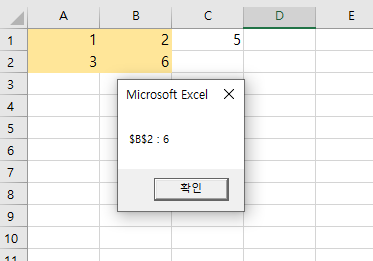 KeyCells로 설정한 Range("A1:B2") 내의 값이 수의 의 되면 Msgbox로 알림을 주도록 구현했습니다.