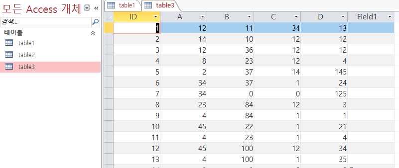 저는 table1, table2, table3라는 3개의 테이블을 만들어주었습니다.