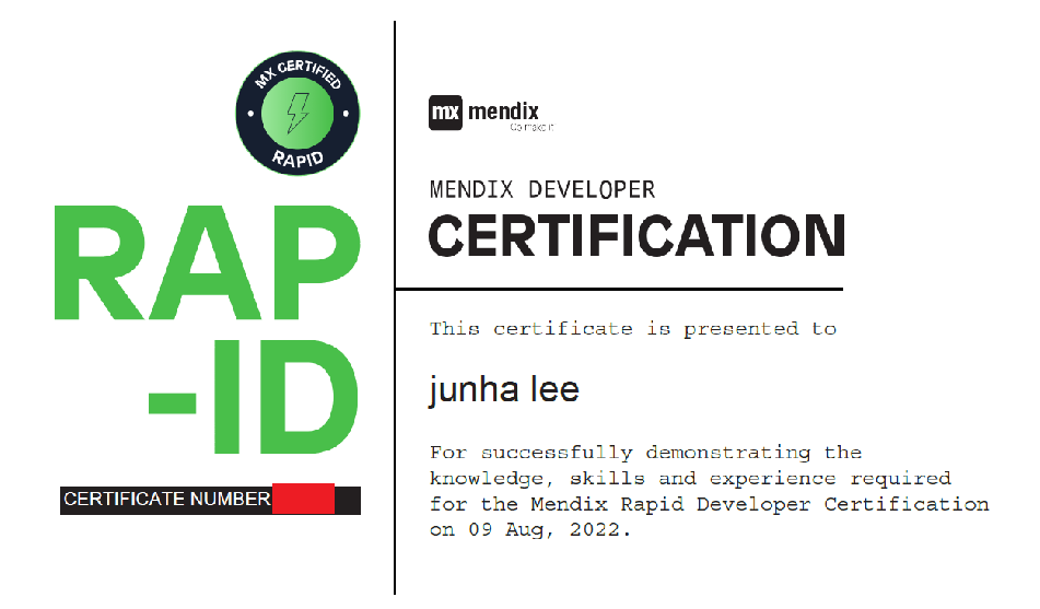 Rapid Developer의 경우 온라인으로 시험이 치뤄지며, 별도의 캠 사용이나 화면 공유를 하지 않습니다. 또한, 검색이 허용되기 때문에 별도의 공부 없이도 쉽게 취득할 수 있습니다. (아래 사진은 제가 취득한 자격 증명서입니다.)