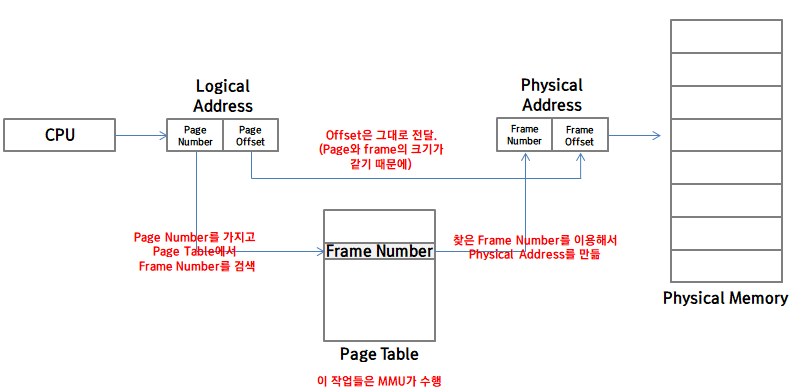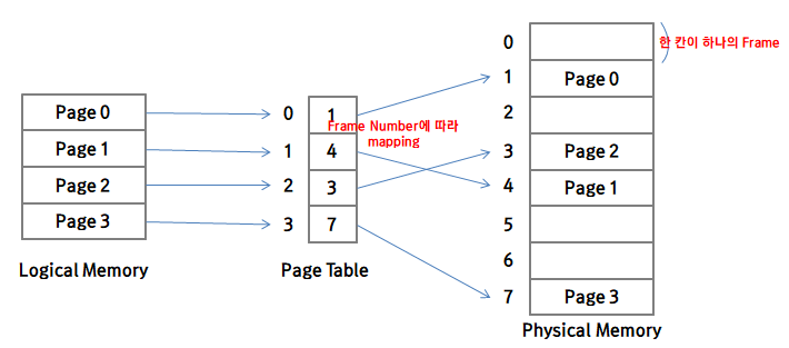 이런 방식을 사용하면 각각의 프로세스들은 물리 메모리에서 굳이 연속된 파티션을 할당 받을 필요가 없습니다. 물리 메모리의 어떤 프레임이든 비어있다면 사용할 수 있기 때문에 external fragmentation은 사라지게 되고, 메모리 사용의 효율을 크게 늘릴 수 있습니다.
