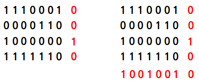 패리티 검사는 데이터 뒤에 하나의 비트를 추가하여 오류가 있는지 찾아내는 방법입니다. 데이터는 0과 1로만 이루어져 있기 때문에, 마지막에 비트 하나를 추가해서 데이터의 1의 총개수를 짝수 또는 홀수로 맞추는 형태입니다. 짝수로 맞추는지 홀수로 맞추는지는 정해놓기 나름이기 때문에 여기서는 짝수로 맞추는 것으로 가정하도록 하겠습니다. 참고로 짝수로 맞추는 경우를 Even Parity, 홀수로 맞추는 경우를 Odd Parity라고 합니다.