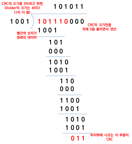 CRC의 크기는 정하기 나름이고, 여기서는 3자리로 가정하고 진행하겠습니다. CRC가 3자리이면 Divider는 그 보다 1 큰 4자리 수로 정해줍니다. 그리고 위와 같은 exclusive연산을 하여 CRC 값을 구해줍니다. 그리고 구한 CRC 값을 원래의 데이터에 붙여, 위의 예시를 따르면 101110011과 같은 꼴로 송신을 해줍니다.