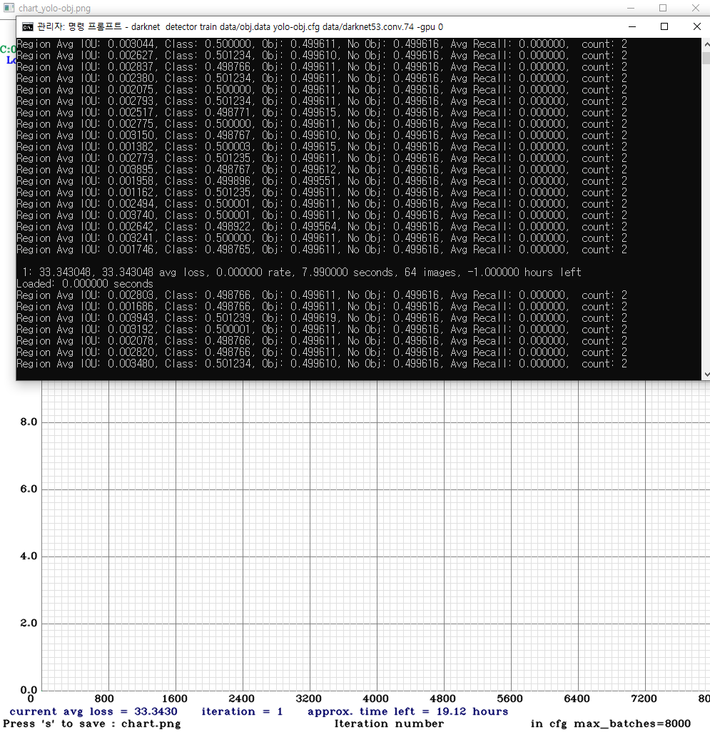 그리고 엔터를 치면 학습이 시작됩니다. cmd 창에서 계속 내용이 올라오고, 그래프 창이 떠 있으면 학습이 제대로 시작된 것입니다.