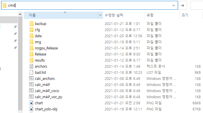 [yolo]에 anchors라는 항목이 있을 것입니다. 우선 Desktop\darknet-master\build\darknet\x64라는 폴더로 이동해서 경로에 cmd를 검색하면 해당 경로의 cmd 창이 뜨게 됩니다.