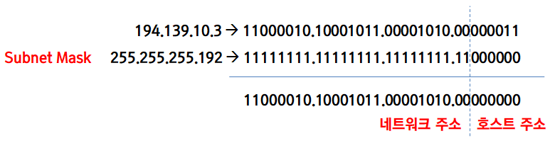 110으로 시작하는 것을 보면 알 수 있듯이, 194.139.10.3은 C 클래스의 IP 주소입니다. C 클래스에서는 마지막 8자리가 호스트 주소로 사용됩니다. 하지만 8자리 중 2개는 서브넷 주소로 사용하고 싶다면 위와 같이 서브넷 마스크를 만들어주면 됩니다. 상위 24개 비트는 당연히 클래스 식별자와 네트워크 주소이니 1로 채워주고, 마지막 8자리 중 서브넷에 해당되는 자리 수만큼 1로 더 채워주면 됩니다.