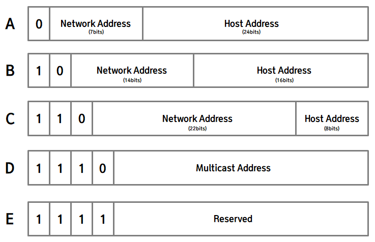 IP 주소는 네트워크 주소와 호스트 주소로 이루어집니다. 한 네트워크 안에 속하는 모든 호스트들의 네트워크 주소는 동일해야 합니다. 송신자가 보낸 데이터는 우선 네트워크 주소를 이용해 목적지가 속한 네트워크를 찾은 뒤, 그 안에서 호스트 주소를 이용해 정확한 수신자를 찾아갑니다. 이 네트워크 주소와 호스트 주소의 길이, 그리고 목적에 따라 A부터 E까지의 클래스로 나누어집니다. 각 클래스들은 가장 앞의 비트들을 이용해 서로 구분됩니다.