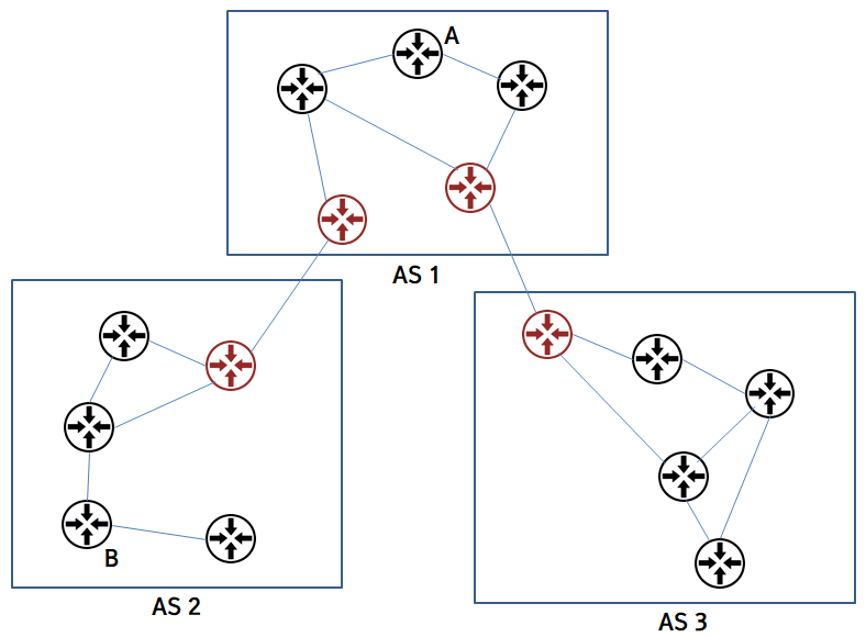 만일 AS 1에 속해있는 A에서 AS 2의 B에 패킷을 보내고 싶다면 어떤 게이트웨이로 패킷을 전달해야 할지 어떻게 알 수 있을까요? 이를 위해 AS 1과 연결된 AS 2와 AS 3을 통해 갈 수 있는 목적지를 학습하고 있어야 하고, 이는 AS 1의 모든 라우터에게 전파되어 있어야 합니다.