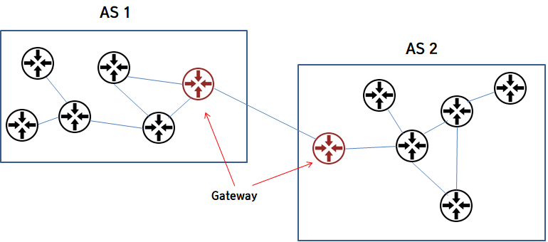 AS 내부에서는 자신들의 프로토콜을 이용해 네트워크를 운용하기 때문에, 인접한 AS와도 사용하는 프로토콜이 다를 수밖에 없습니다. 그래서 AS끼리 연결을 해주기 위해, AS들의 가장자리에 게이트웨이(Gateway)라는 장비를 위치시켜 줍니다. 만일 패킷을 다른 AS로 보내주어야 한다면, 이 게이트웨이에게로 패킷을 전달시켜 주면 됩니다. 많은 경우에 게이트웨이를 톨게이트에 비유하기도 합니다.