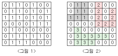 <그림 1>과 같이 정사각형 모양의 지도가 있다. 1은 집이 있는 곳을, 0은 집이 없는 곳을 나타낸다. 철수는 이 지도를 가지고 연결된 집의 모임인 단지를 정의하고, 단지에 번호를 붙이려 한다. 여