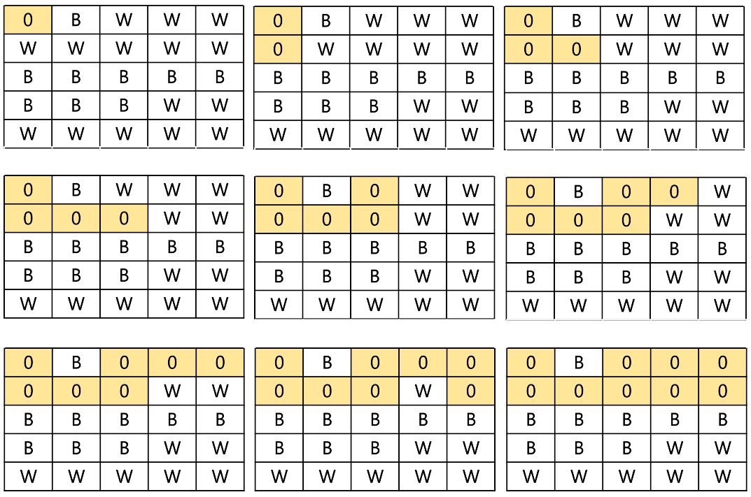 위와 같은 예제에서는 W로 표시된 흰 옷을 입은 아군이 각각 9명, 7명씩 뭉쳐있기 때문에 130의 전투력을, B로 표시된 적군이 각각 1명, 8명씩 뭉쳐있기 때문에 65의 전투력을 발휘할 수 있습니다.