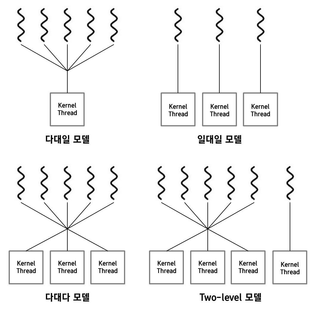 다대다 모델에 일대일 모델을 결합한 Two-level 모델 이라는 것도 존재합니다. 이는 다대다 모델을 기본으로 하지만, 일대일 모델처럼 하나의 user thread가 하나의 kernel thread에만 연결되는 것을 허용하는 모델입니다.