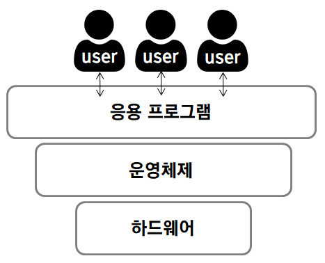 컴퓨터 시스템은 위의 그림과 같은 형태로 이루어져 있습니다. 하드웨어는 중앙 처리 장치(CPU), 메모리, 입출력 장치와 같은 물리적 장치를 뜻합니다. 그리고 응용 프로그램은 우리가 사용하는 Kakao Talk, MS Word, Visual Studio과 같은 실제 프로그램들을 말하죠. 그 사이를 이어주는 것이 운영체제라는 것인데요, 즉, 운영체제는 하드웨어와 응용 프로그램 사이에서 중개역할을 하는 프로그램으로, 사용자 프로그램들을 실행하고, 문제점들을 쉽게 해결하며, 컴퓨터 시스템을 사용하기 쉽게 만들어주고, 효율적인 방법으로 컴퓨터 하드웨어를 사용할 수 있게 해주는 것을 목표로 합니다.